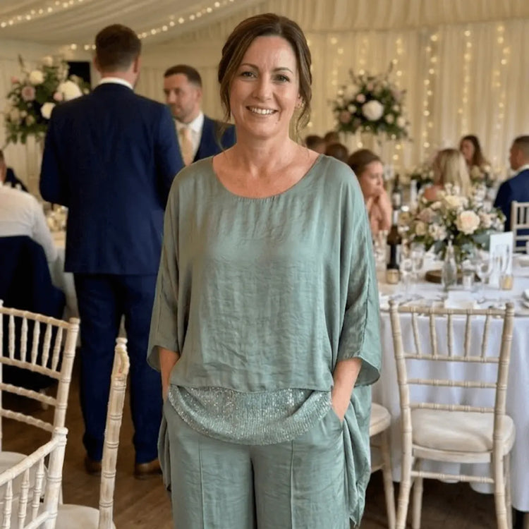Das Mirette-Set bietet zurückhaltende, fließende Eleganz – gemacht für die moderne Frau, die Komfort mit einem raffinierten Finish schätzt. Die lockere Bluse verfügt über ein integriertes Satin-Effekt-Panel, das das Licht sanft einfängt, während die gerade geschnittene Hose eine einfache, verlängerte Silhouette schafft. Ideal für besondere Anlässe oder jeden Tag, an dem Sie mühelosen Stil wünschen.